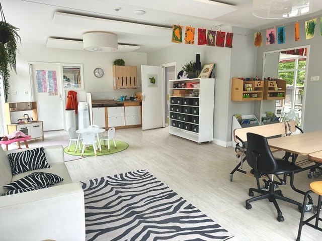 Het kinderdagverblijf bestaat uit meerdere ruimtes: een rust/ stilte ruimte voor de allerkleinsten, een ruimte waar de kinderen eten en drinken, spelen en creatieve activiteiten doen (stamgroep) en een ruimte waar de kinderen o.a. kunnen spelen met constructiemateriaal. Alle ruimtes zijn zeer licht en kijken uit op de ruime buitenspeelplaats met giga zandbak, speelheuvel en diverse dieren. Er is zelfs een aparte buitenruimte waar de aller kleinste veilig en fijn buiten kunnen rond kruipen en van de konijnen en vogels kunnen genieten.