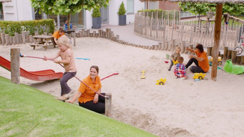 De buitenomgeving vinden wij heel belangrijk en is kenmerkend voor onze kinderopvang. Deze moet uitdagend en uitnodigend zijn om in te spelen. We hebben geprobeerd de kinderen uit te dagen tot beweging en ontwikkeling van spel en vaardigheden door een veilige en kindvriendelijke ruimte te creëren. Naast een groot speelpleinbeschikken wij over een grote speelberg. Op de speelberg bevinden zich verschillende speeltoestellen waarop de kinderen naar hartelust kunnen klauteren en klimmen. Onder de speelberg bevindt zich een enorme zandspeelplaats met een prachtige zandtafel in de vorm van een draak.